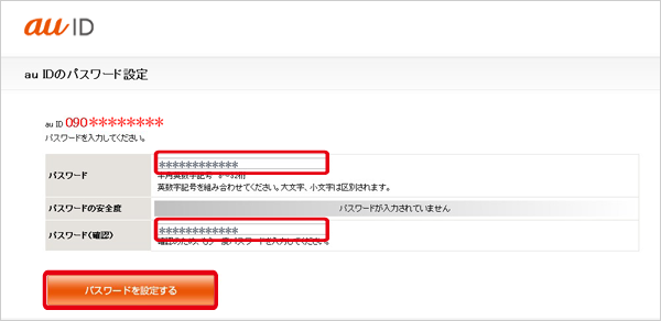 接続しているデータ通信端末のau/UQ mobile電話番号と、暗証番号を入力し、「au IDの新規登録・パスワード再設定」ボタンをクリックしてください。